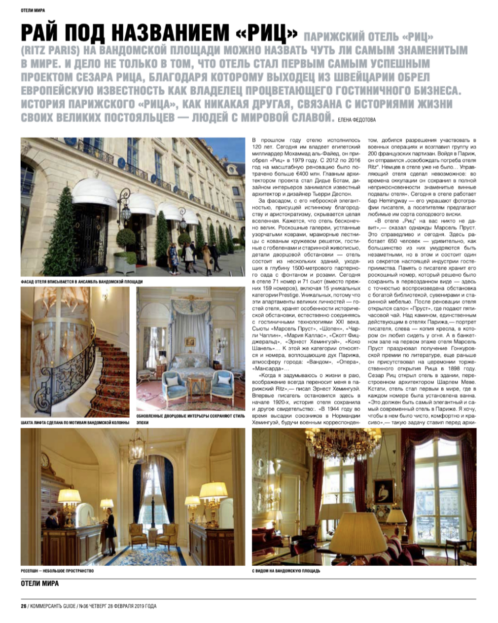«Территория комфорта» — приложение к газете Коммерсантъ в Санкт-Петербурге знакомит читателей с отелем Ritz Paris, который в 2018 году отметил 120-летие со дня основания швейцарцем Цезарем Ритцем. В отеле 142 номера, включая коллекцию из 15 Prestige Suites, названных в честь своих знаменитых постояльцев.