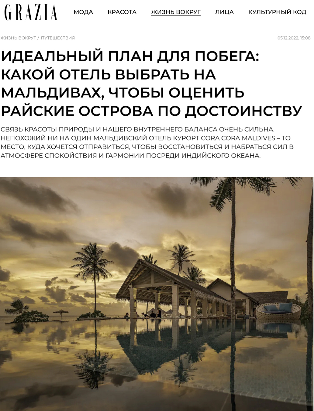 «Пятизвездочный курорт Cora Cora Maldives, открывшийся прошлой осенью, расположен на острове Маамигили в 45 минутах впечатляющего живописными пейзажами полета на гидроплане от Мале. Это первый отель в атолле Раа, практикующий бережное отношение к окружающей среде и получивший сертификат ведущей международной программы в области устойчивого туризма Green Globe.»