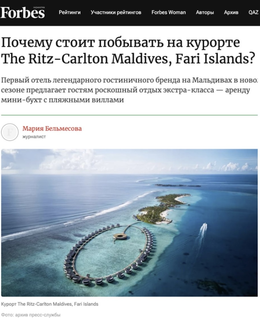 «При упоминании Мальдив возникает образ райских островов с нетронутой природой. Однако есть места, где картинка в стиле Баунти сочетается с роскошью, стильным дизайном и превосходным сервисом: курорт The Ritz-Carlton Maldives, Fari Islands — именно из таких.»