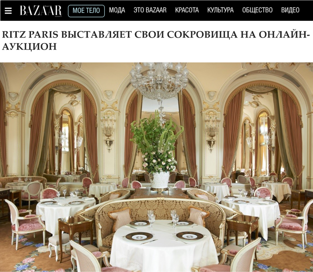 «Легендарный отель Ritz Paris снова решил порадовать ценителей интерьерного искусства, выставив на продажу более 1500 лотов. Это уже второй аукцион парижского Ritz после реновации. Торги пройдут 21, 22 и 23 июня. Тема аукциона — гастрономия, его проведение поручено французскому аукционному дому Artcurial.»